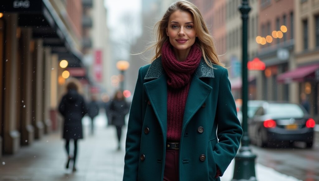 Then come the Jewel Tones, and they’re here to bring life to the winter palette. Shades like deep Teal Blue, Cherry Red, and Burgundy are turning heads for all the right reasons. These colors have depth — they look luxurious under soft winter light and photograph beautifully. A teal wool coat over black trousers instantly elevates your look, while a cherry red sweater paired with neutral pants adds a pop of energy that still feels refined. Burgundy, on the other hand, is the underdog of the season — elegant, moody, and perfect for layering. A velvet blazer or knit dress in this shade instantly gives off quiet-luxury vibes.